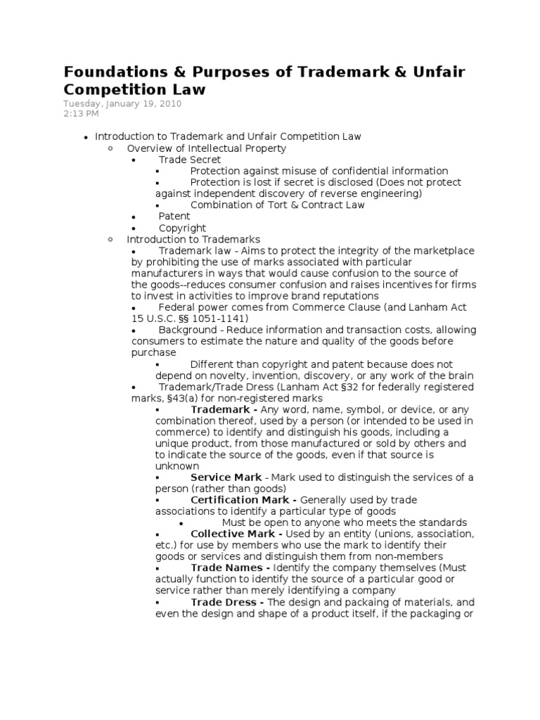 Tuesday, January 19, 2010 2:13 PM Introduction to Trademark and Unfair Competition Law o Overview of Intellectual Property Trade Secret Protection against misuse of confidential information Protection is lost if secret is disclosed (Does not protect