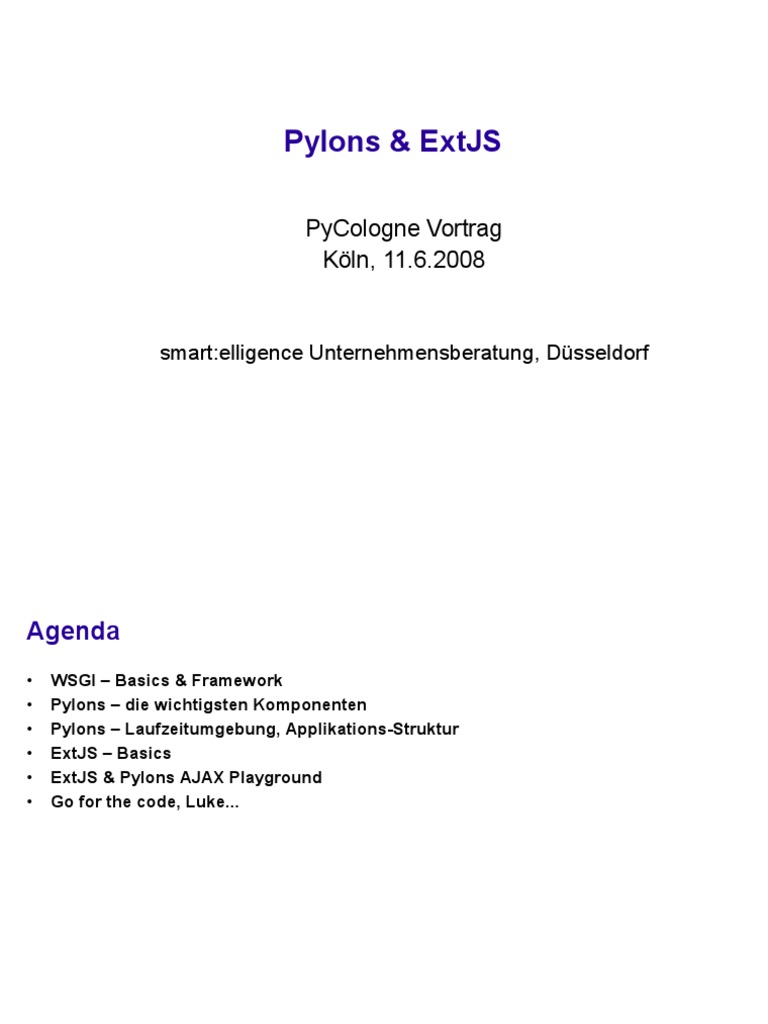 WSGI Basics & Framework Pylons die wichtigsten Komponenten Pylons Laufzeitumgebung, Applikations-Struktur ExtJS Basics ExtJS & Pylons AJAX Playground Go for the code, Luke...