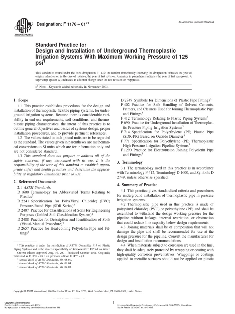 Design and Installation of Underground Thermoplastic Irrigation Systems With Maximum Working Pressure of 125 Psi
