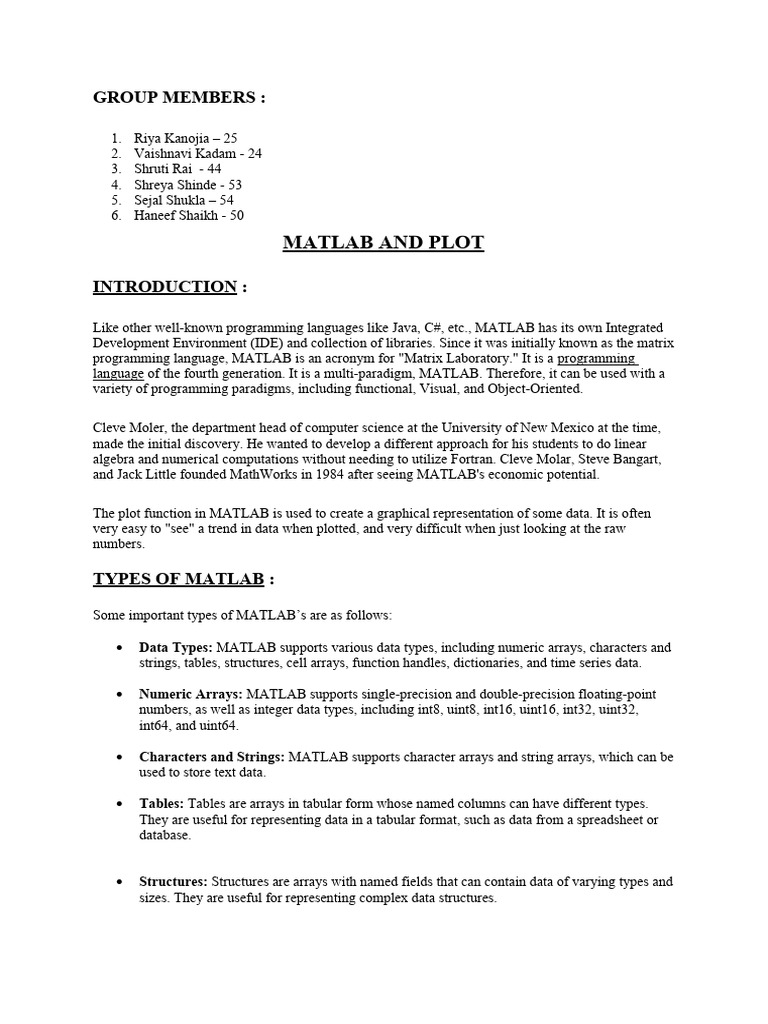 Data Types: MATLAB supports various data types, including numeric arrays, characters and
