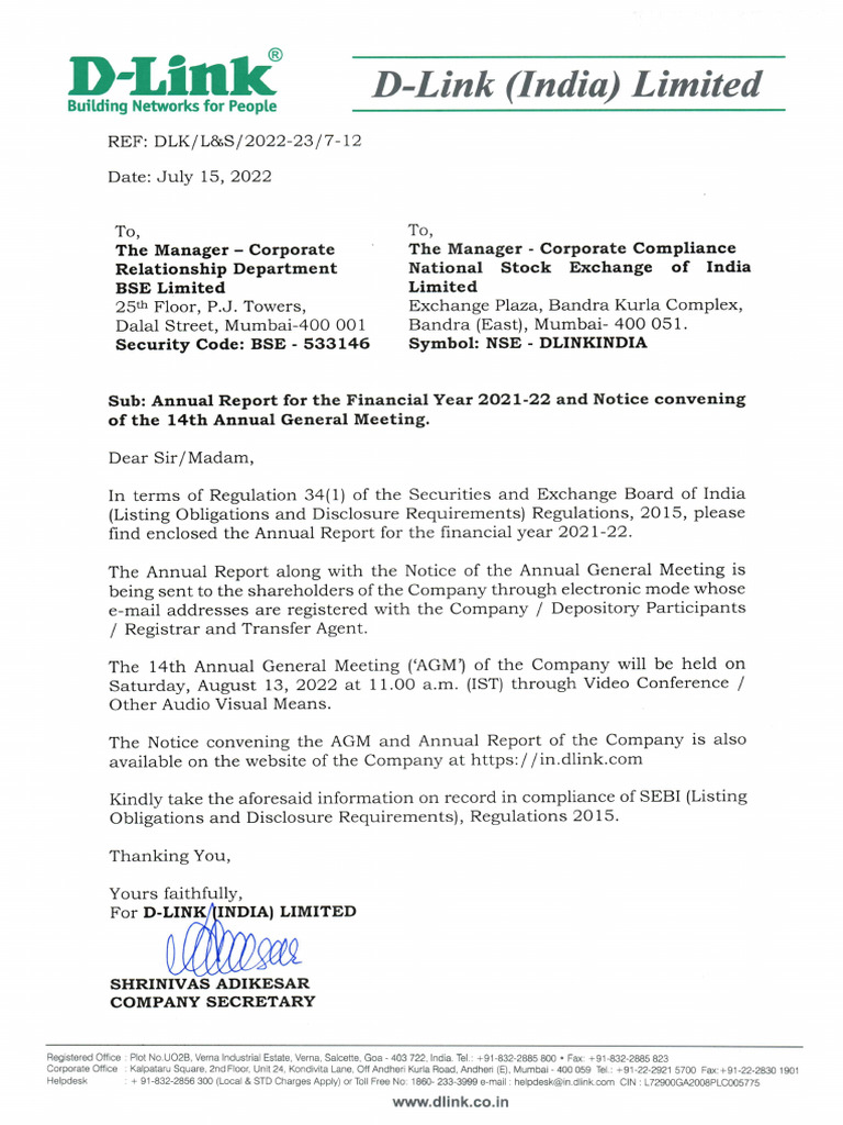 for the financial year 2021-22 will also be available on the Company’s website https://in.dlink.com and websites of the Stock Exchanges. However,