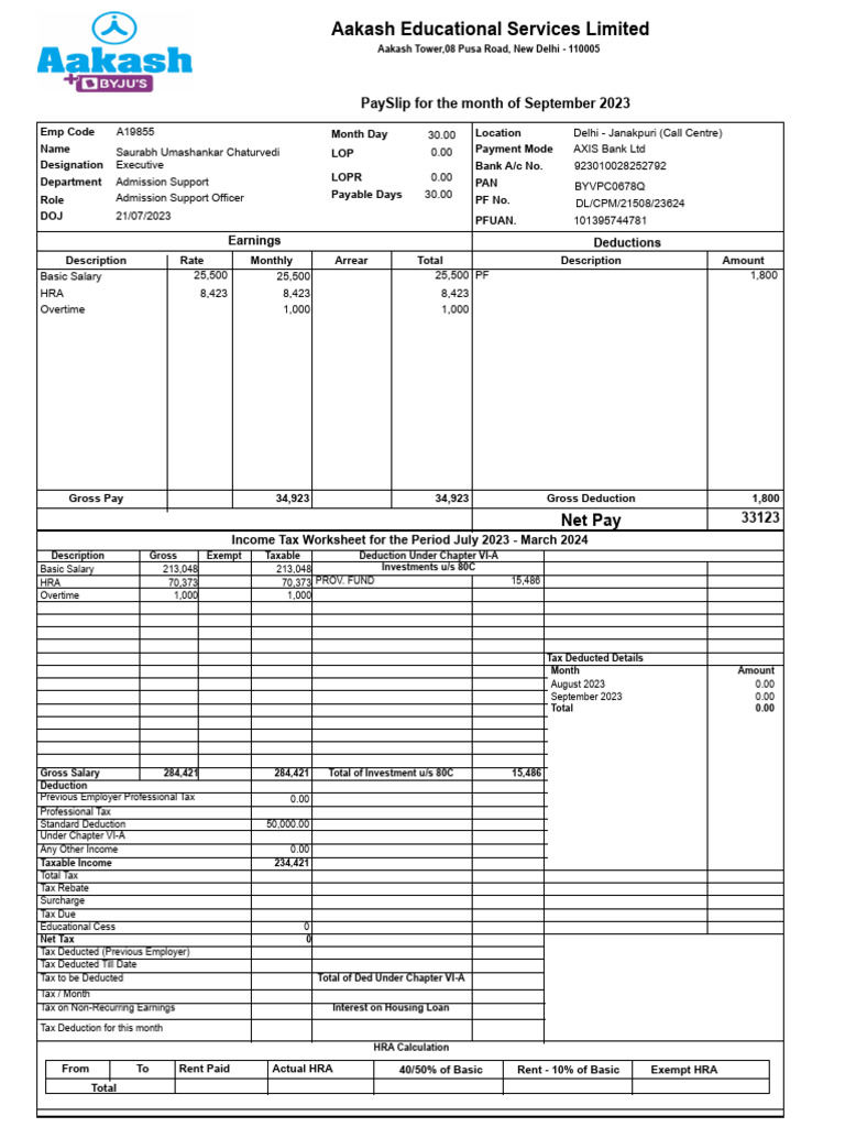 Name Saurabh Umashankar Chaturvedi LOP 0.00 Payment Mode AXIS Bank Ltd