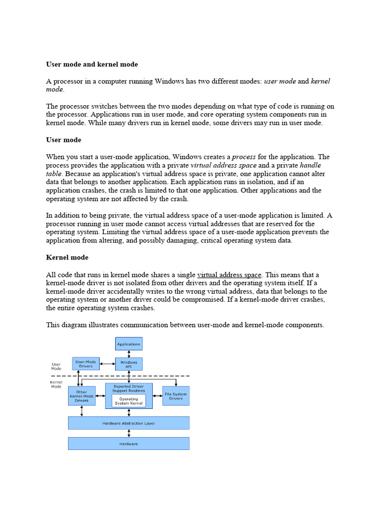 the processor. Applications run in user mode, and core operating system components run in