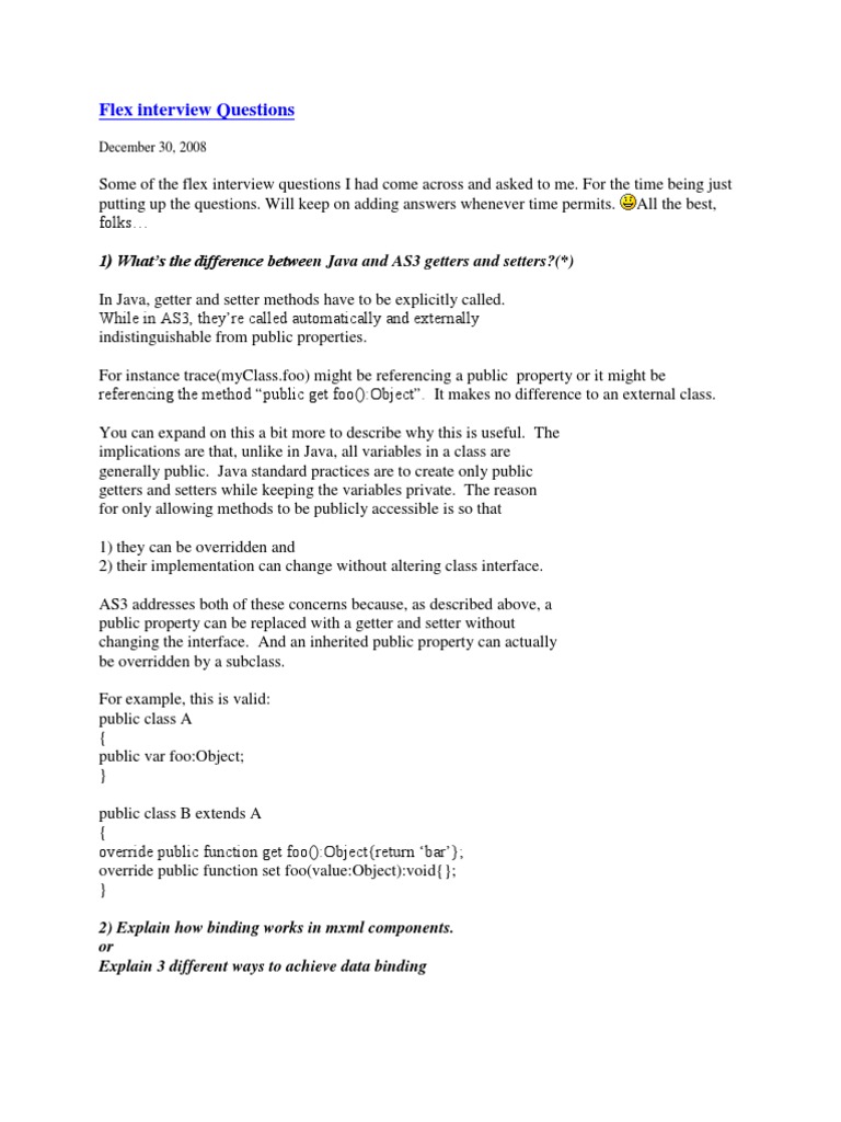 Some of the flex interview questions I had come across and asked to me. For the time being just putting up the questions. Will keep on adding answers whenever time permits. All the best, folks 1) Whats the difference between Java and AS3 getters and setters?(*) In Java, getter and setter methods have to be explicitly called. While in AS3, theyre called automatically and externally indistinguishable from public properties. For instance trace(myClass.foo) might be referencing a public property or it might be referencing the method public get foo():Object. It makes no difference to an external class. You can expand on this a bit more to describe why this is useful. The implications are that, unlike in Java, all variables in a class are generally public. Java standard practices are to create only public getters and setters while keeping the variables private. The reason for only allowing methods to be publicly accessible is so that 1) they can be overridden and 2) their implementation can change without altering class interface. AS3 addresses both of these concerns because, as described above, a public property can be replaced with a getter and setter without changing the interface. And an inherited public property can actually be overridden by a subclass. For example, this is valid: public class A { public var foo:Object; } public class B extends A { override public function get foo():Object{return bar}; override public function set foo(value:Object):void{}; } 2) Explain how binding works in mxml components. or Explain 3 different ways to achieve data binding