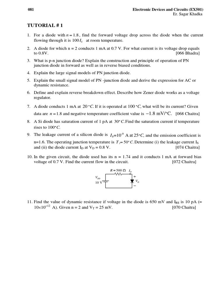 1. For a diode with n 1.8 , find the forward voltage drop across the diode when the current
