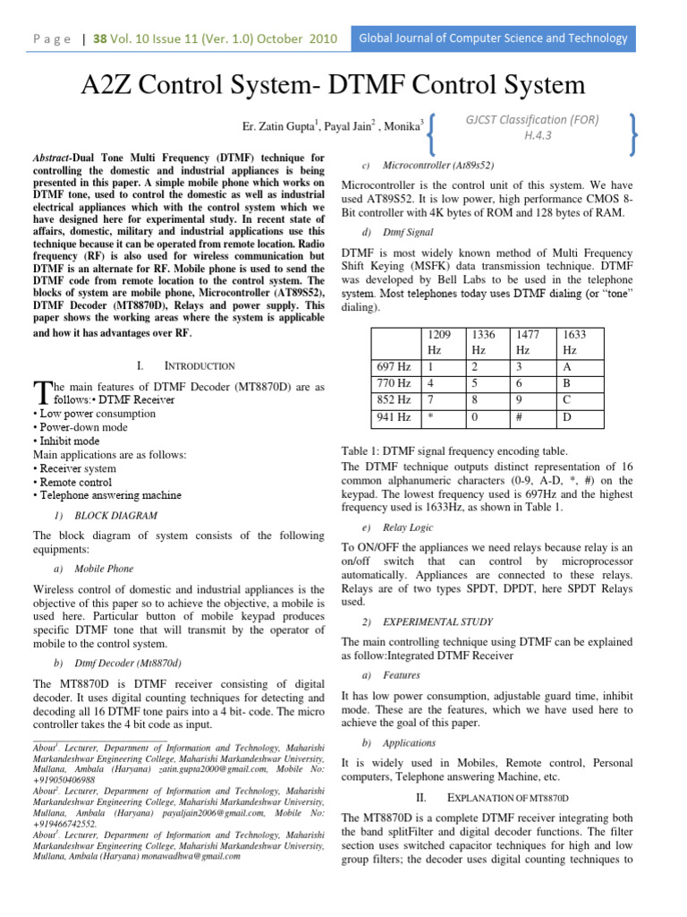 as to charge mobile phone and to blow the bulb. (DTMF) Signals”, Technology Conference, Ottawa,