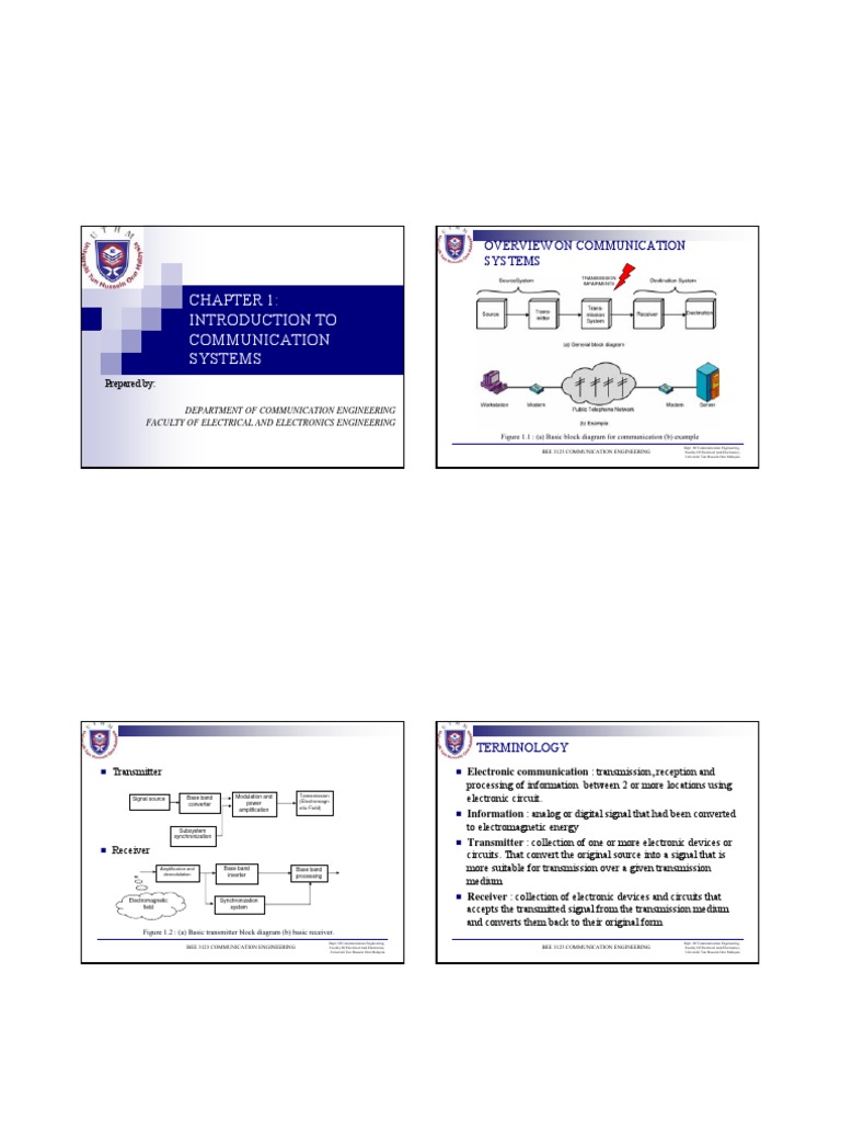 Electronic communication : transmission, reception and processing of information between 2 or more locations using electronic circuit. Information : analog or digital signal that had been converted to electromagnetic energy Transmitter : collection of one or more electronic devices or circuits. That convert the original source into a signal that is more suitable for transmission over a given transmission medium Receiver : collection of electronic devices and circuits that accepts the transmitted signal from the transmission medium and converts them back to their original form