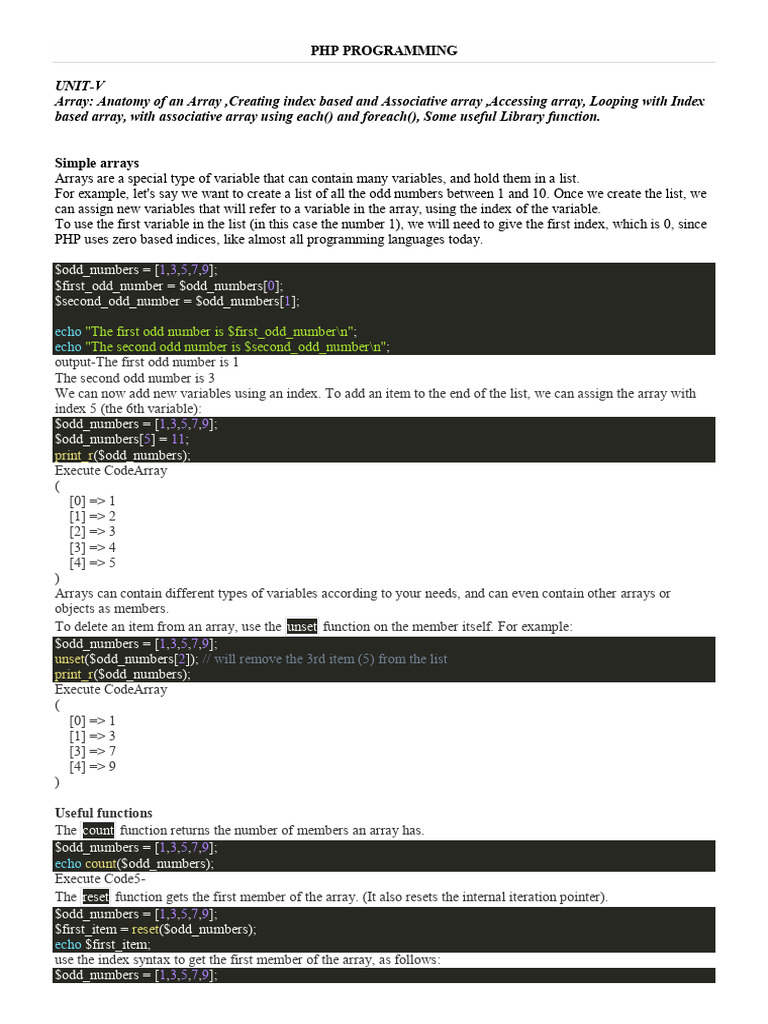 Array: Anatomy of an Array ,Creating index based and Associative array ,Accessing array, Looping with Index