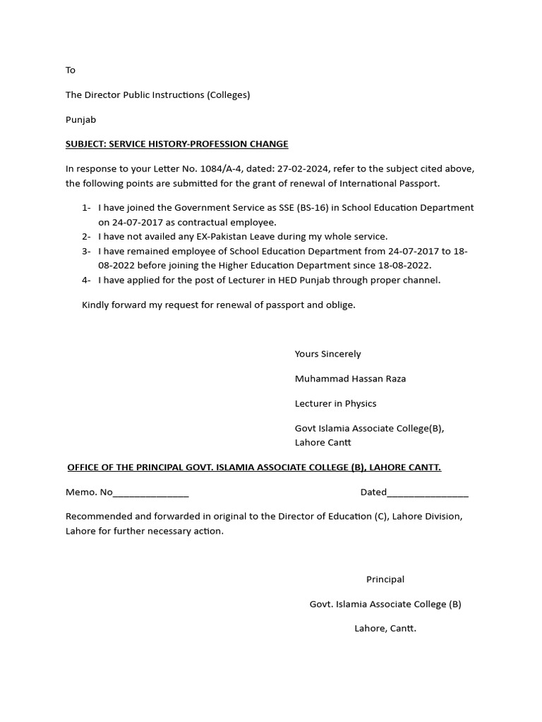 Recommended and forwarded in original to the Director of Education (C), Lahore Division,