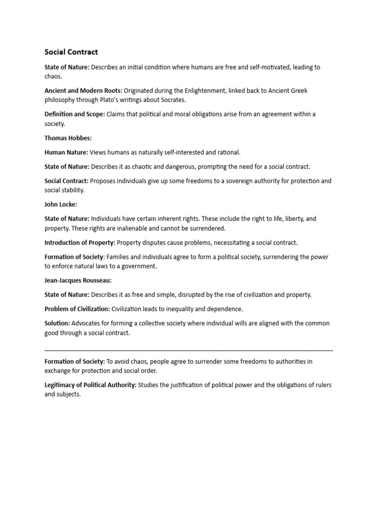 Social Contract: Proposes individuals give up some freedoms to a sovereign authority for protection and