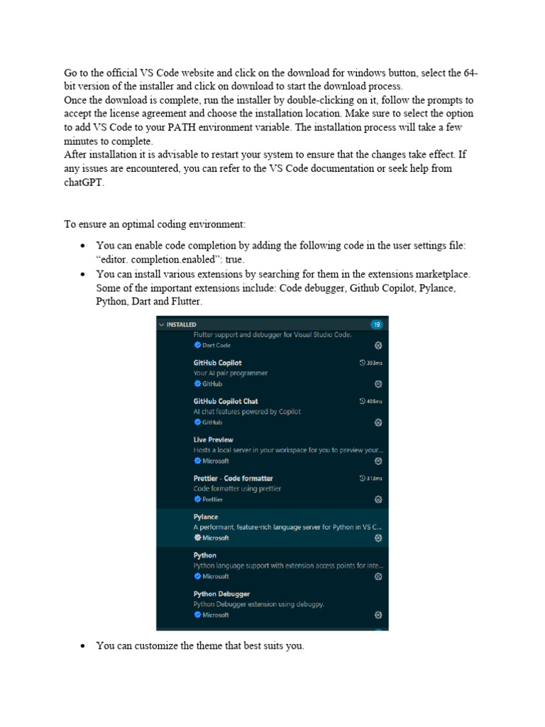 Some of the important extensions include: Code debugger, Github Copilot, Pylance,