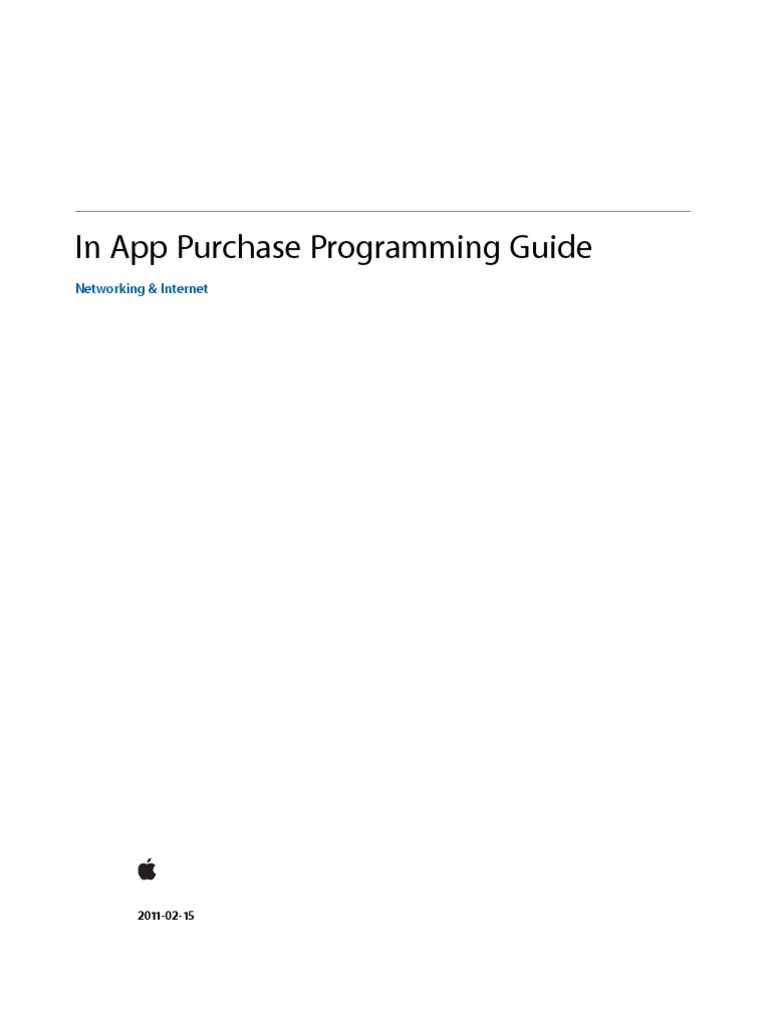 This table describes the changes to In App Purchase Programming Guide. Date 2011-02-15 Notes Apps must always retrieve product information before submitting a purchase; this ensures that the item has been marked for sale. Information added about renewable subscriptions. Minor edits. Minor clarifications to SKRequest. Fixed a typo in the JSON receipt object. Receipt data must be base64 encoded before being passed to the validation server. Other minor updates. Revised introductory chapter. Clarified usage of receipt data. Recommended the iTunes Connect Developer Guide as the primary source of information about creating product metadata. Renamed from "Store Kit Programming Guide" to "In App Purchase Programming Guide". Revised to include discussion on retrieving price information from the Apple App Store as well as validating receipts with the store. New document that describes how to use the StoreKit API to implement a store with your application.
