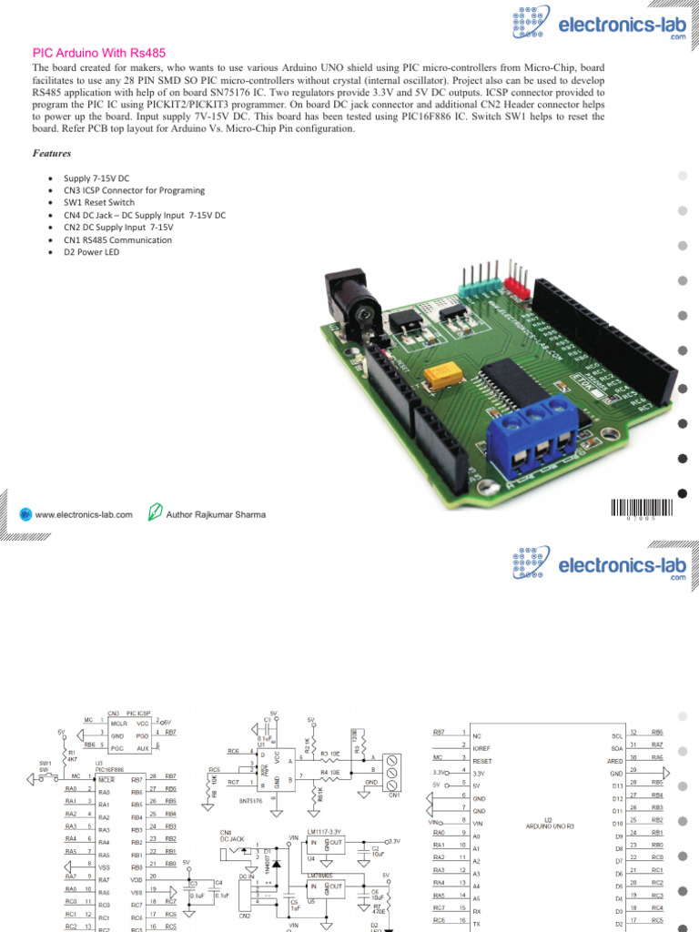 RS485 application with help of on board SN75176 IC. Two regulators provide 3.3V and 5V DC outputs. ICSP connector provided to