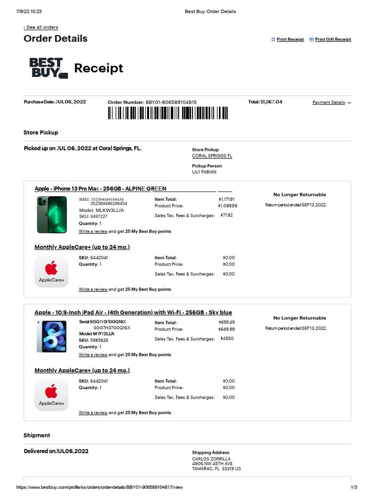 Purchase Date: JUL 06, 2022 Order Number: BBY01-806589104815 Total: $1,867.04 Payment Details