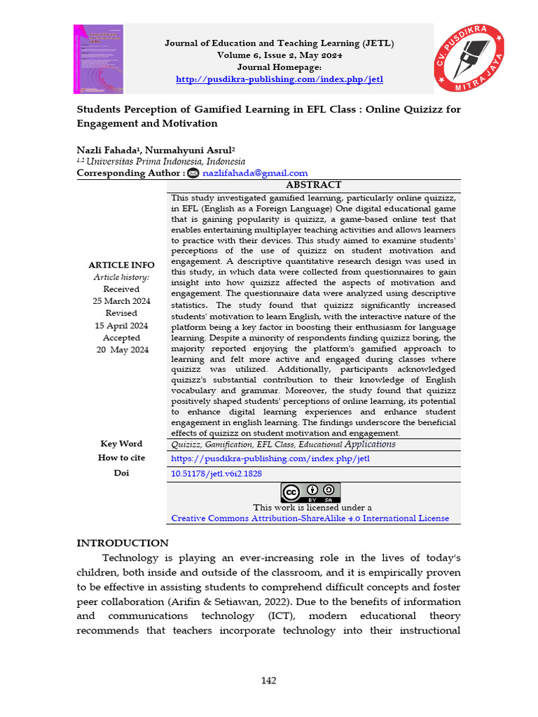 Syafriafdi, N. (2023). The Role of Quizizz Application in Learning : A literature