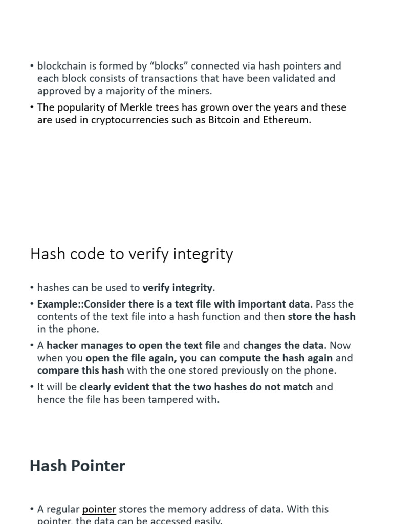 • So a hash pointer points to the data and also allows us to verify the