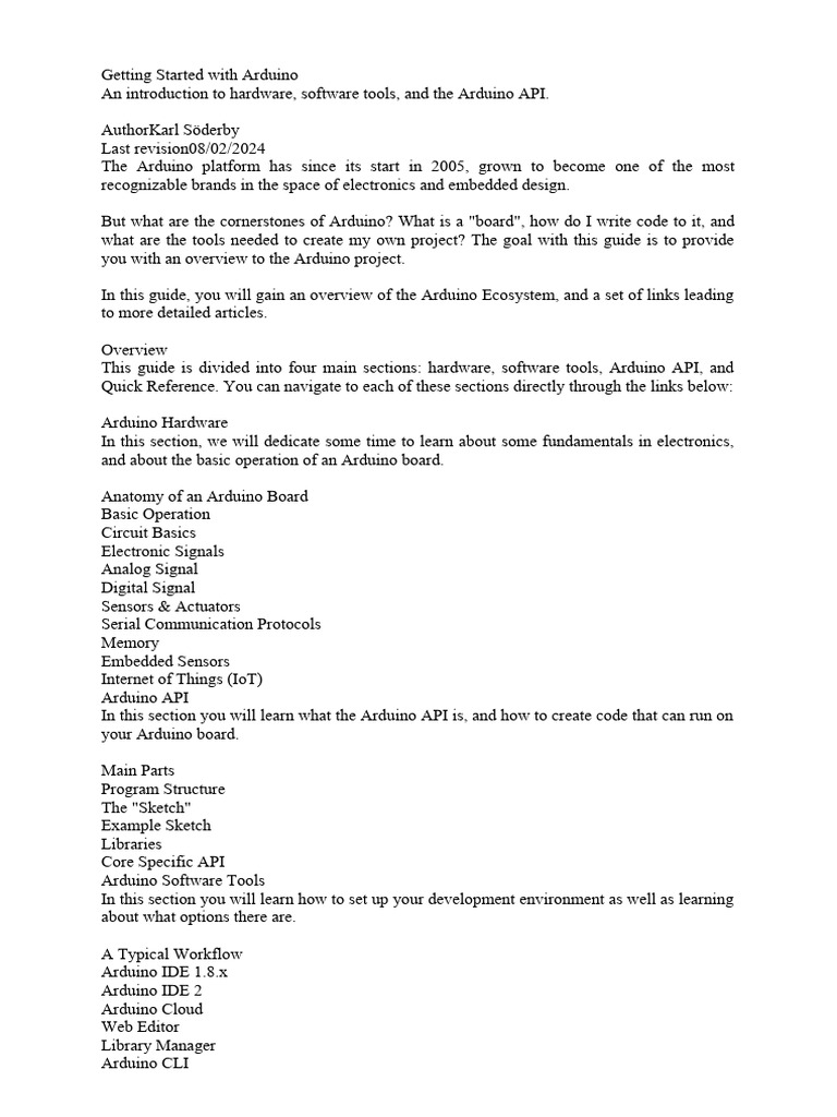 This guide is divided into four main sections: hardware, software tools, Arduino API, and