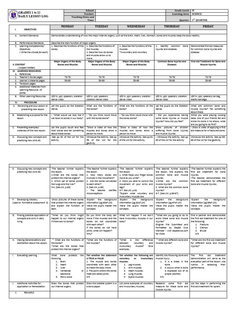 C. Learning Competencies/ 1. Describe the functions of the 1. Describe the functions of 1. Describe the functions of the 1. Identify common bone Demonstrate first aid measures
