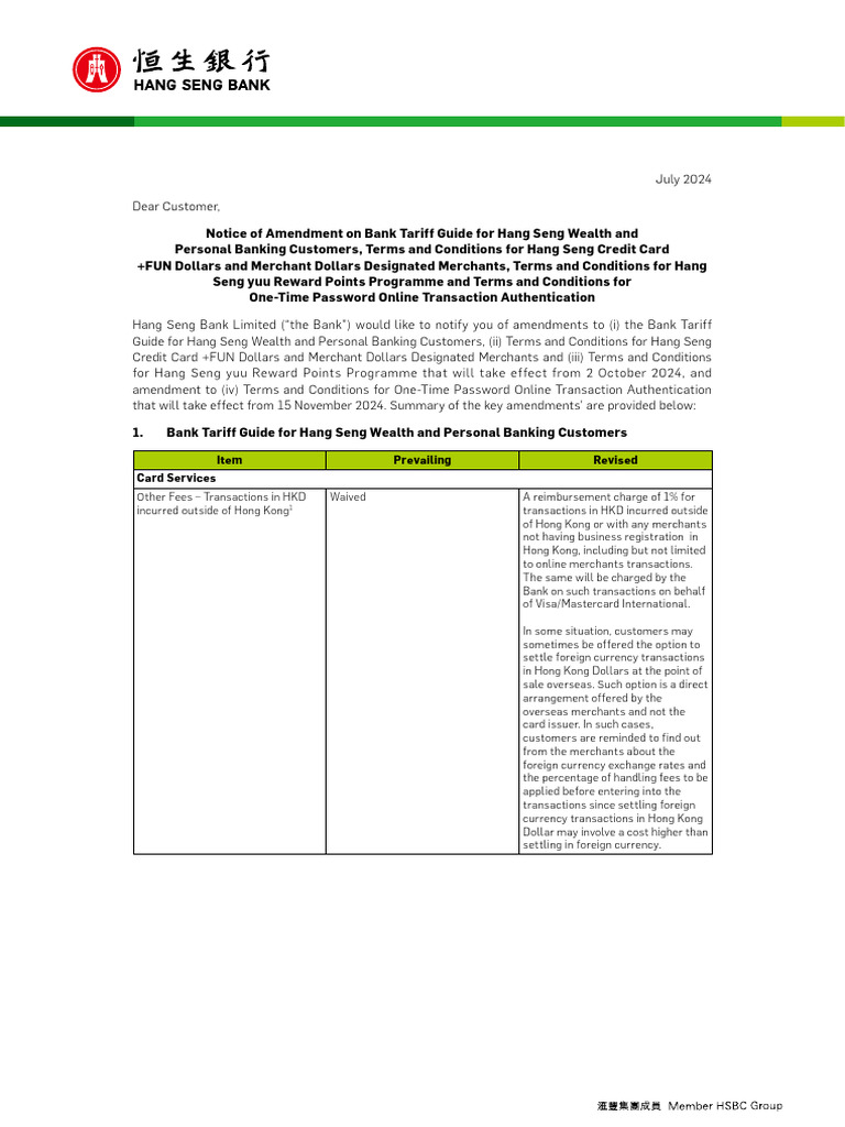 Hang Seng Bank Limited (“the Bank”) would like to notify you of amendments to (i) the Bank Tariff