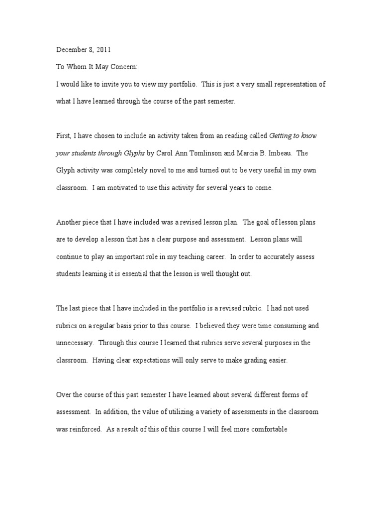 December 8, 2011 To Whom It May Concern: I would like to invite you to view my portfolio.