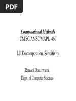 That is, A = L1 U1 . For = 102k , k = 1, 2, . . . , 10, use MatLab and this LU factorization to compute the solution of Ax = b. That is, use the MatLab backslash operator \ rst to solve L 1 y = b for y in MatLab by y = L1 \ b and then to solve U1 x = y for x in MatLab by x = U1 \ y. How does the accuracy of the computed solution behave as the value of decreases? (b) If you do pivot, the LU factorization of A is P2 = 0 1 1 0 L2 = 1 0 1 U2 = 1 1 0 1
