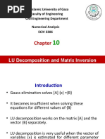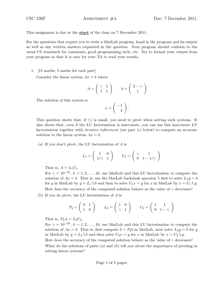 That is, P2 A = L2 U2 . For = 102k , k = 1, 2, . . . , 10, use MatLab and this LU factorization to compute the solution of Ax = b. That is, rst compute = P2 b in MatLab, next solve L2 y = for y b b in MatLab by y = L2 \ and then solve U2 x = y for x in MatLab by x = U2 \ y. b How does the accuracy of the computed solution behave as the value of decreases? What do the solutions of parts (a) and (b) tell you about the importance of pivoting in solving linear systems? Page 1 of 5 pages.