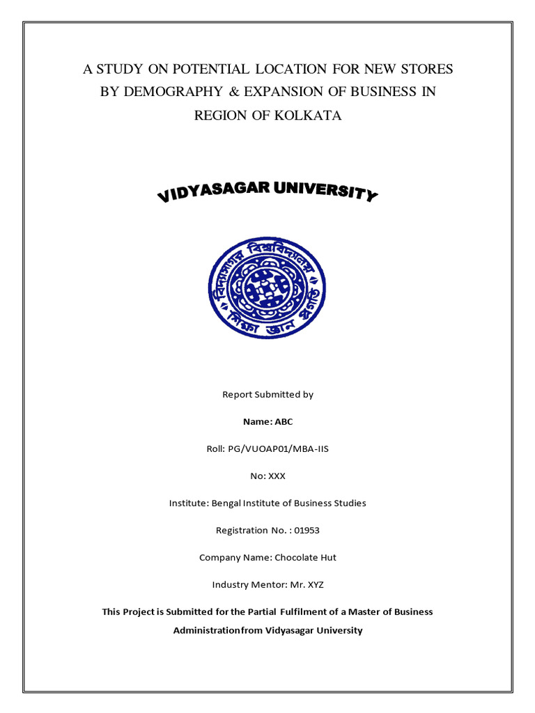 KOLKATA’’ submitted by me for the award of the degree of Master of Business