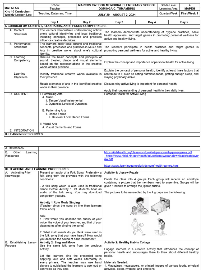 MATATAG Teacher DOMINGA C. TUMAMBING Learning Area MAPEH