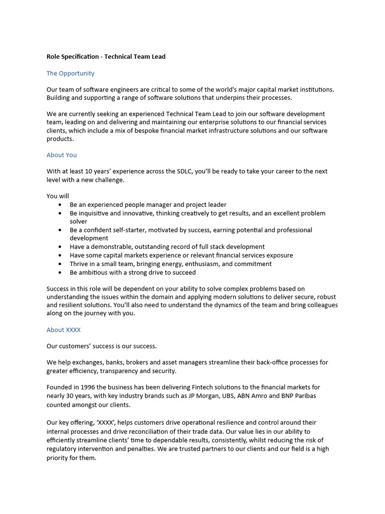 Role Specification - Technical Team Lead