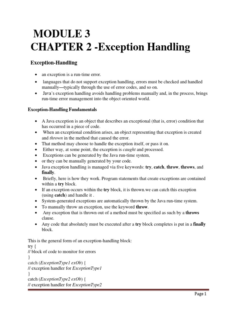 • Java exception handling is managed via five keywords: try, catch, throw, throws, and