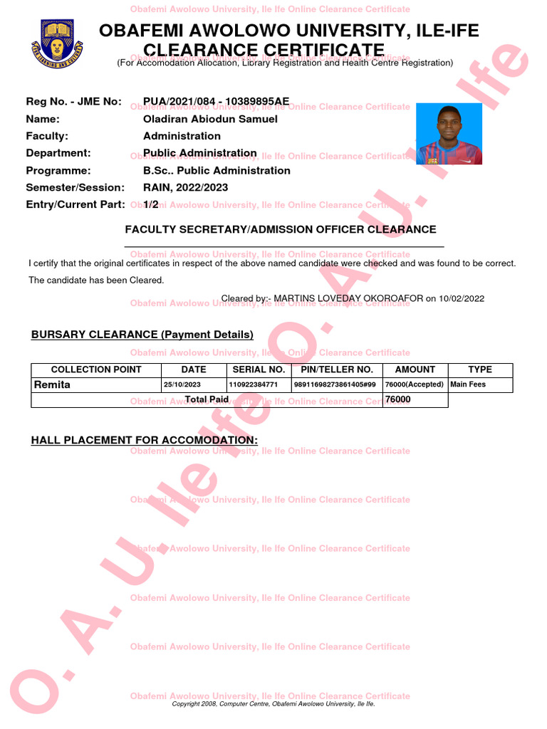 1/2 Awolowo University, Ile Ife Online Clearance Certificate