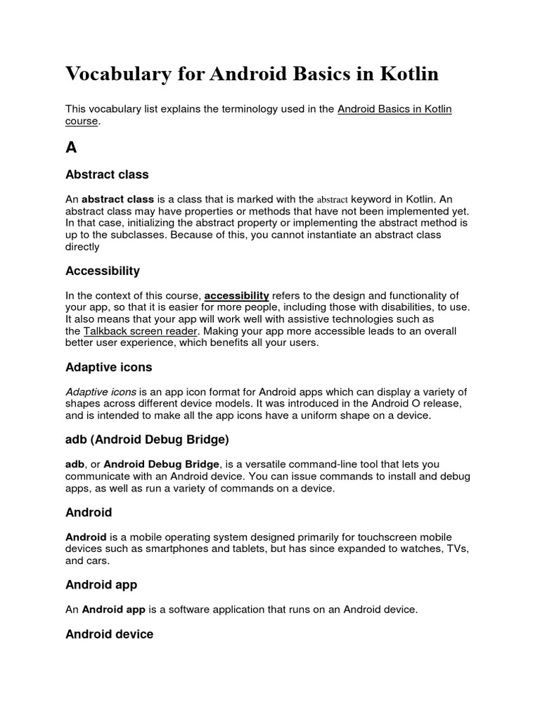 This vocabulary list explains the terminology used in the Android Basics in Kotlin