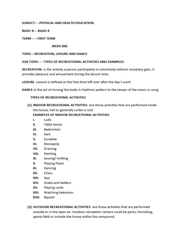 SUB TOPIC---- TYPES OF RECREATIONAL ACTIVITIES AND EXAMPLES