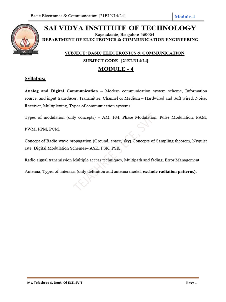 Types of modulation (only concepts) – AM, FM, Phase Modulation, Pulse Modulation, PAM,