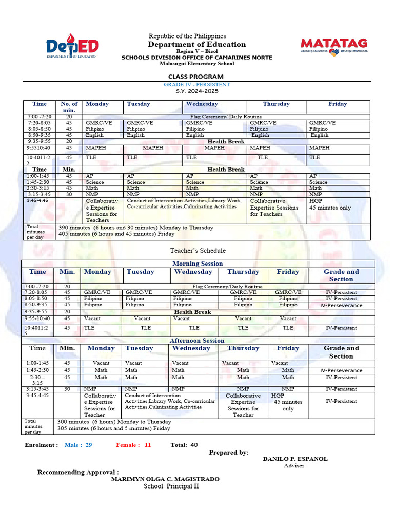 8:50-9:35 45 Filipino Filipino Filipino Filipino Filipino IV-Perseverance
