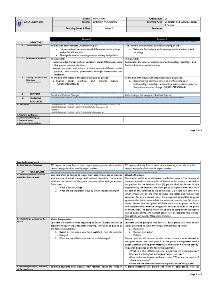 DAILY LESSON LOG Teacher Dannel A. Pon-an Learning Area Understanding Culture, Society