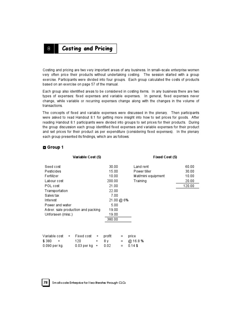 Costing and pricing are two very important areas of any business. In smallscale enterprise women very often price their products without undertaking costing. The session started with a group exercise. Participants were divided into four groups. Each group calculated the costs of products based on an exercise on page 57 of the manual. Each group also identified areas to be considered in costing items. In any business there are two types of expenses: fixed expenses and variable expenses. In general, fixed expenses never change, while variable or recurring expenses change along with the changes in the volume of transactions. The concepts of fixed and variable expenses were discussed in the plenary. Then participants were asked to read Handout 8.1 for getting more insight into how to set prices for goods. After reading Handout 8.1 participants were divided into groups to set prices for their products. During the group discussion each group identified fixed expenses and variable expenses for their product and set prices for their product as per expenditure (considering fixed expenses). In the plenary each group presented its findings, which are as follows: