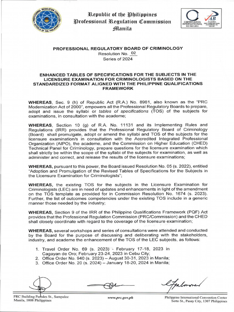 2024 Licensure Examination for Criminologists and the subsequent schedules thereof.