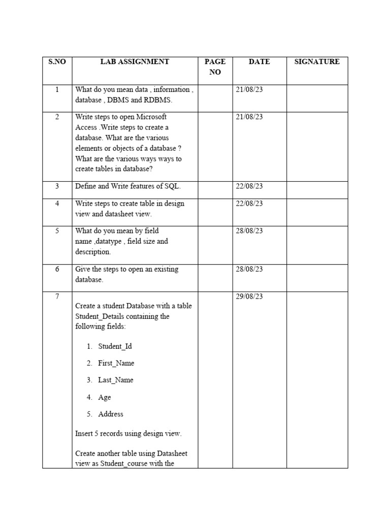 NO LAB ASSIGNMENT PAGE DATE SIGNATURE