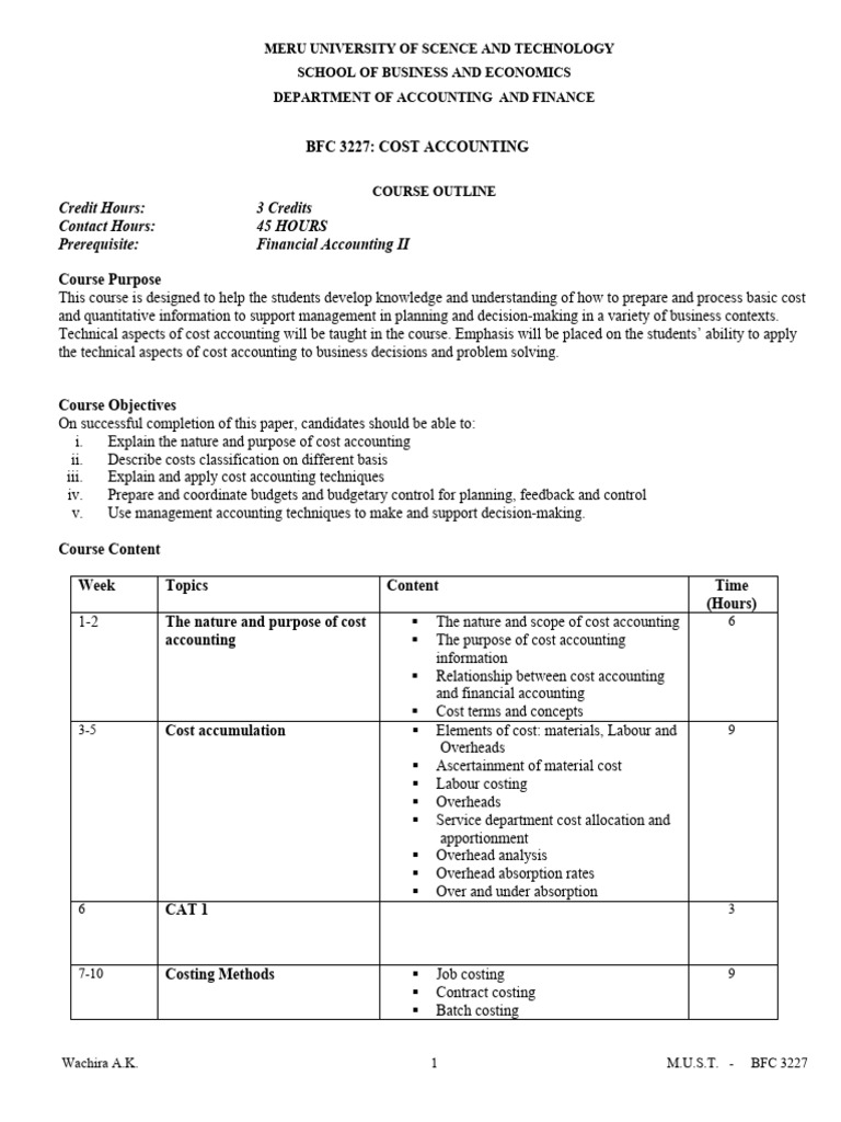 BFC 3227: Cost Accounting: Credit Hours: 3 Credits Contact Hours: 45 Hours Prerequisite: Financial Accounting II