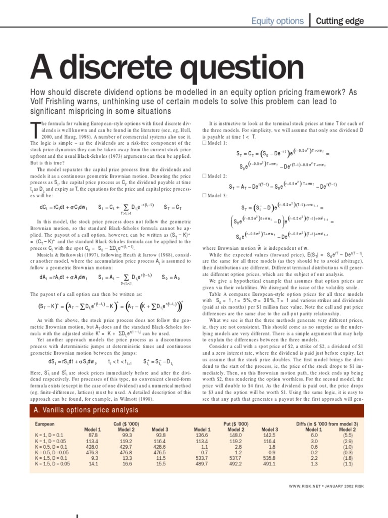 ropean-style counterparts. This could be expected because calls are not optimal to exercise under models 1 or 2 and, again, short of reverting to numeric methods, it is unclear how to adjust the pricing to take account of discrete dividends. Hull (2000) and Haug (1998) provide a closed-form formula for pricing American-style options with one known dividend. The formula, however, appears incorrect as the price of the American-style call expiring immediately after the dividend is $88,173 less than the $96,197 of the European-style option expiring just before. In any case, the formula is not applicable as the volatility is not constant. The answer to the question of which model reflects reality better and provides consistent pricing across a range of options is almost self-evident. It seems that the third model is more in agreement with the actual evolution of the price process and should be used, particularly if pricing of exotics is required. It should be pointed out that the three models compared in this note are well known, although the second one, which models the accumulation process, is less familiar than the others. However, no source known to us analyses the differences between these models or recommends one in preference to another. Moreover, it appears that some commercial systems use or at least provide these models quite arbitrarily and inconsistently, thus leading to potentially dangerous mispricing and mishedging of the portfolios. We have no doubt that many practitioners and quantitative analysts grappled with this problem at some time in their careers and may have arrived at conclusions similar to those outlined. If this article makes the quantitative analyst community more aware of these pitfalls, and helps them to price their positions correctly, then it will have fulfilled its purpose. Volf Frishling is head of quantitative analysis of financial markets at the Commonwealth Bank of Australia and adjunct professor at the University of Technology, Sydney. He would like to thank an anonymous referee for helpful comments