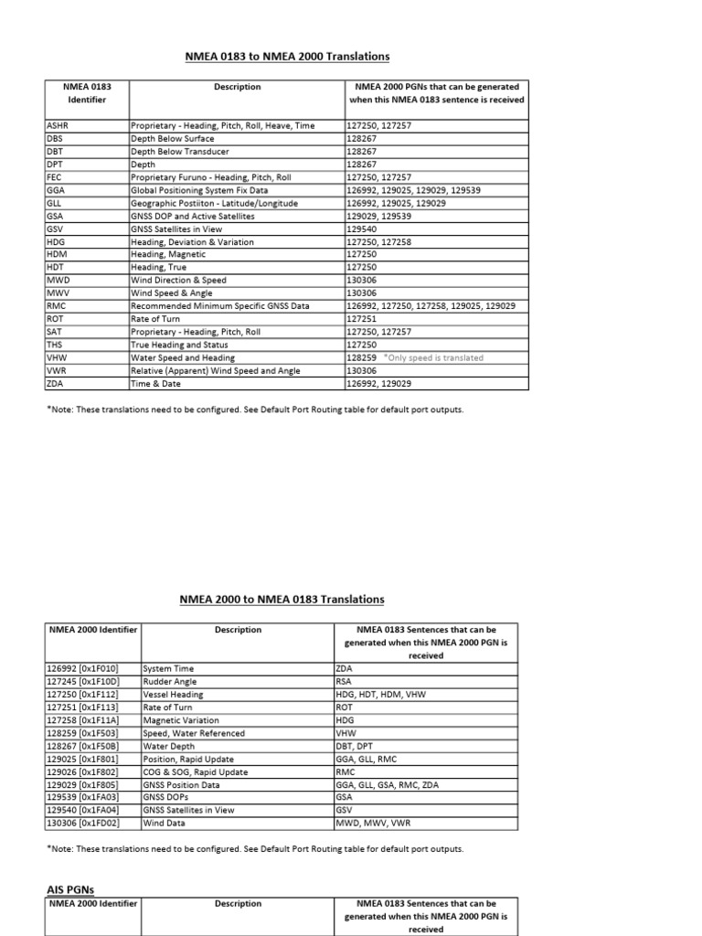 NMEA 2000 to NMEA 0183 Translations