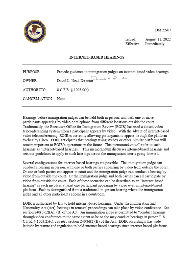 PURPOSE: Provide guidance to immigration judges on internet-based video hearings