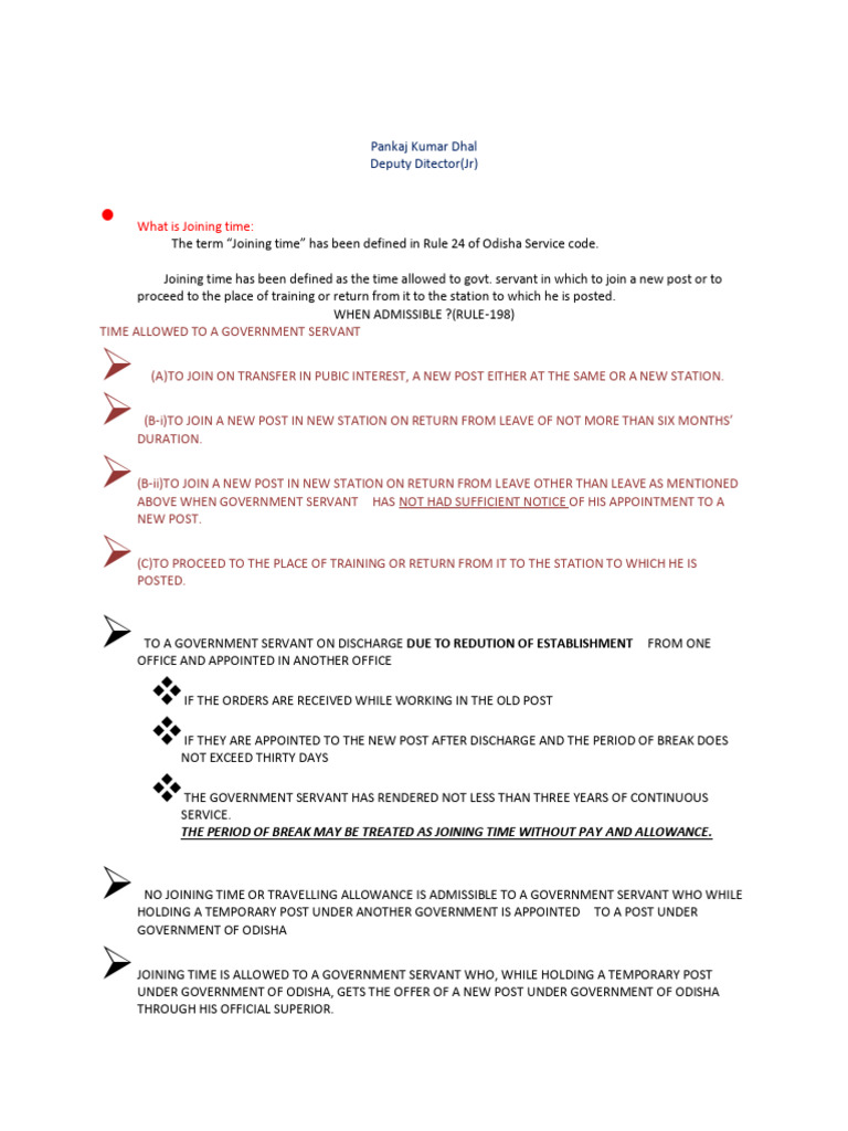 new post(under the Government of Odisha) through his official superiors may be allowed joining time to