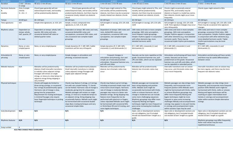 Rhythmic values Dependent on Dependent on tempo: whole, half, Dependent on tempo: 8th notes and rests, Dependent on tempo: 16th notes and 16th notes and rests in more complex 16th notes and rests in more complex 16th notes and rests in more complex