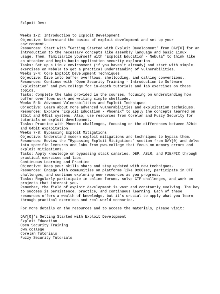Resources: Start with "Getting Started with Exploit Development" from DAY[0] for an