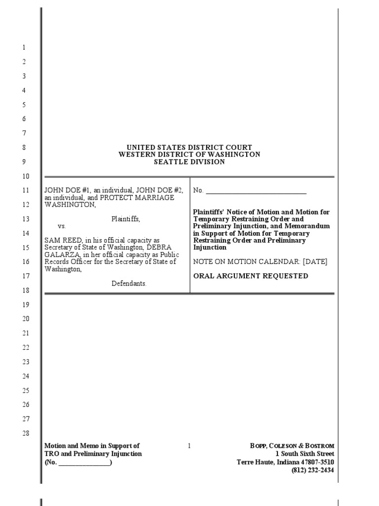 TO DEFENDANTS AND THEIR ATTORNEY(S) OF RECORD: YOU ARE HEREBY GIVEN NOTICE THAT on A DATE TO BE DETERMINED BY COURT ORDER, before a JUDGE TO BE DETERMINED in Courtroom TO BE DETERMINED BY COURT ORDER of the United States District Court for the Western District of Washington, Seattle Division, located at 700 Stewart Street, Seattle, Washington 98101, Plaintiffs John Doe #1, John Doe #2, and Protect Marriage Washington, will and hereby do move for a temporary restraining order and preliminary injunction against Defendants. This motion for temporary restraining order and preliminary injunction is made pursuant to Fed. R. Civ. P. 65, and on the grounds specified in this Notice of Motion and Motion, and Plaintiffs Memorandum in Support of Motion for Temporary Restraining Order and Preliminary Injunction, the documents filed in support thereof, the Verified Complaint, and such other and further evidence as may be presented to the Court at the time of the hearing. Pursuant to this notice, Plaintiffs John Doe #1, John Doe #2, and Protect Marriage Washington do hereby move for a preliminary injunction to: (1) Enjoin Defendants from making referendum petitions available to the public pursuant to the Public Records Act, Wash. Rev. Code 42.56.001 et seq., or otherwise; (2) Enjoin Defendants from making the Referendum 71 petition or any petition related to the definition of marriage or the rights and responsibilities that should be accorded to same-sex couples, available to the public pursuant to the Public Records Act, Wash. Rev. Code 42.56.001 et seq., or otherwise. In support thereof, Plaintiffs present the following Memorandum in Support of Motion for Temporary Restraining Order and Preliminary Injunction.