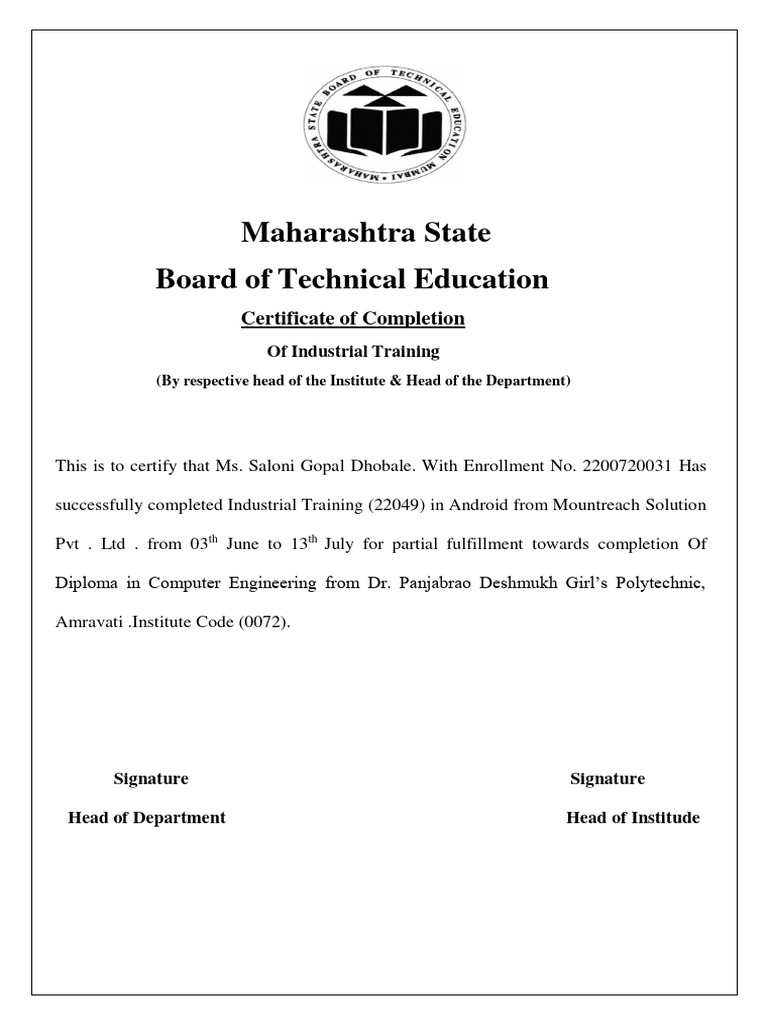 Diploma in Computer Engineering from Dr. Panjabrao Deshmukh Girl’s Polytechnic,