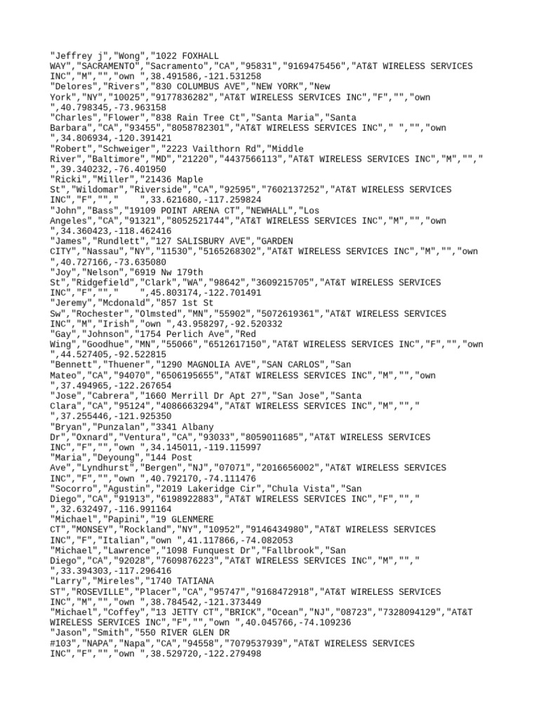 "Jack","Wong","744 Steffan St","Vallejo","Solano","CA","94591","5105010029","AT&T