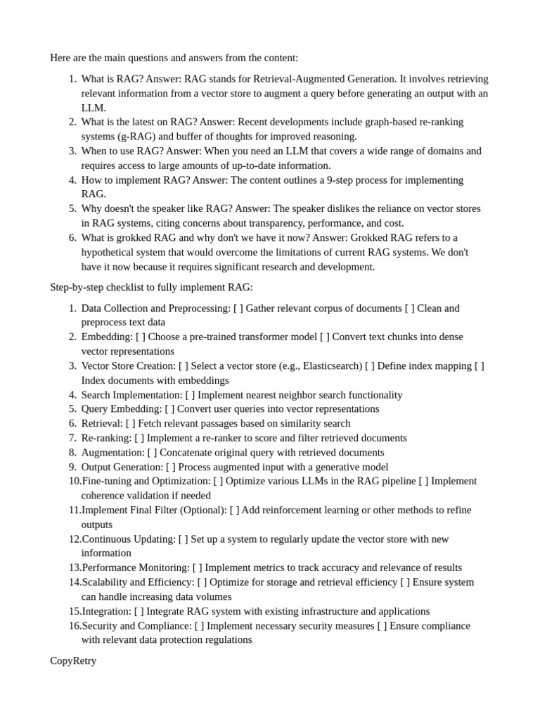 4. How to implement RAG? Answer: The content outlines a 9-step process for implementing